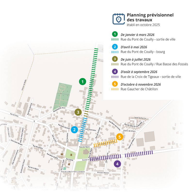 Les travaux concernent un ensemble de rues stratégiques du centre bourg de la commune :