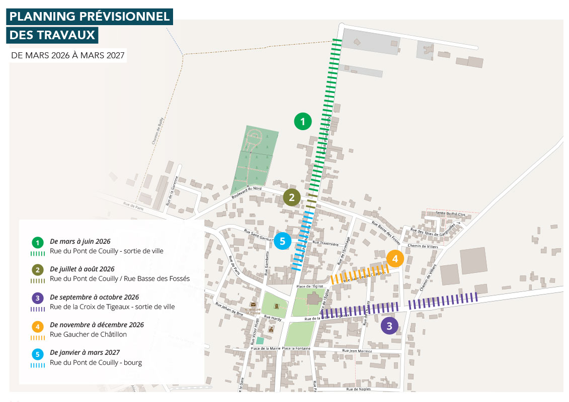 Les travaux concernent un ensemble de rues stratégiques du centre bourg de la commune :